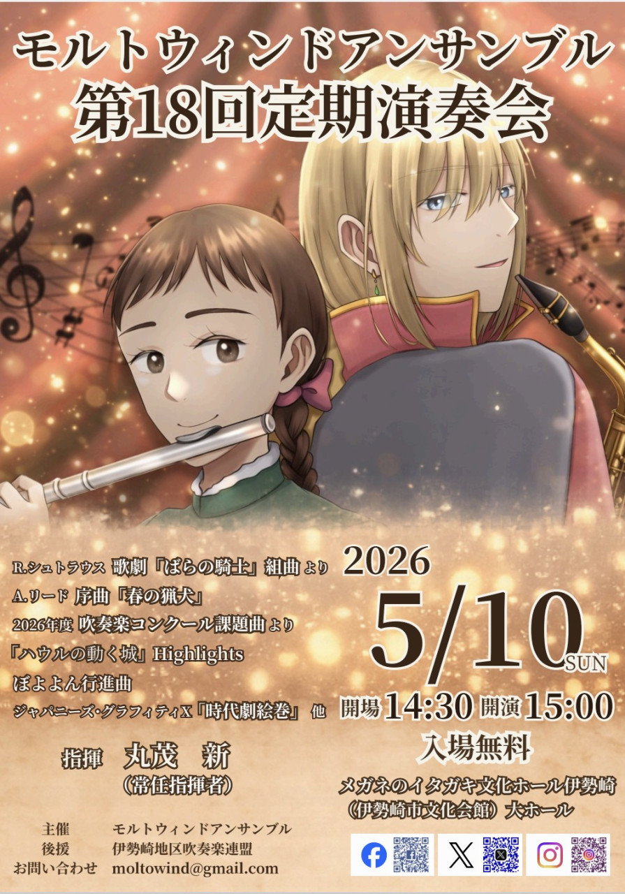 歌劇「ばらの騎士」(R.シュトラウス)をはじめ、2026年度吹奏楽コンクール課題曲、「ハウルの動く城」など、幅広い年代の方にお楽しみいただけるプログラムをご用意しております。