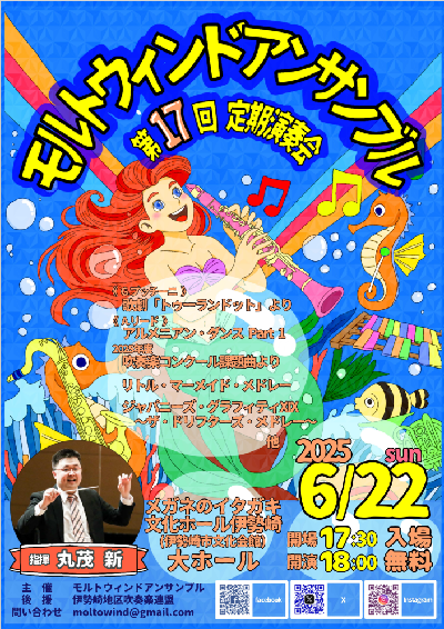 第17回定期演奏会のご案内 モルトウィンドアンサンブルでは、第17回定期演奏会を以下の日程で開催いたします。歌劇「トゥーランドット」や、ザ・ドリフターズメドレーなど、幅広い年代の方に楽しんで頂ける音楽をお届けします。皆様のご来場を、団員一同心よりお待ちしております! 日時:2025年6月22日 日曜 開場 17:30/開演 18:00 ← 夜開催!場所:メガネのイタガキ文化ホール伊勢崎(伊勢崎市文化会館)入場無料(整理券無しですので、当日そのままお越し下さい)